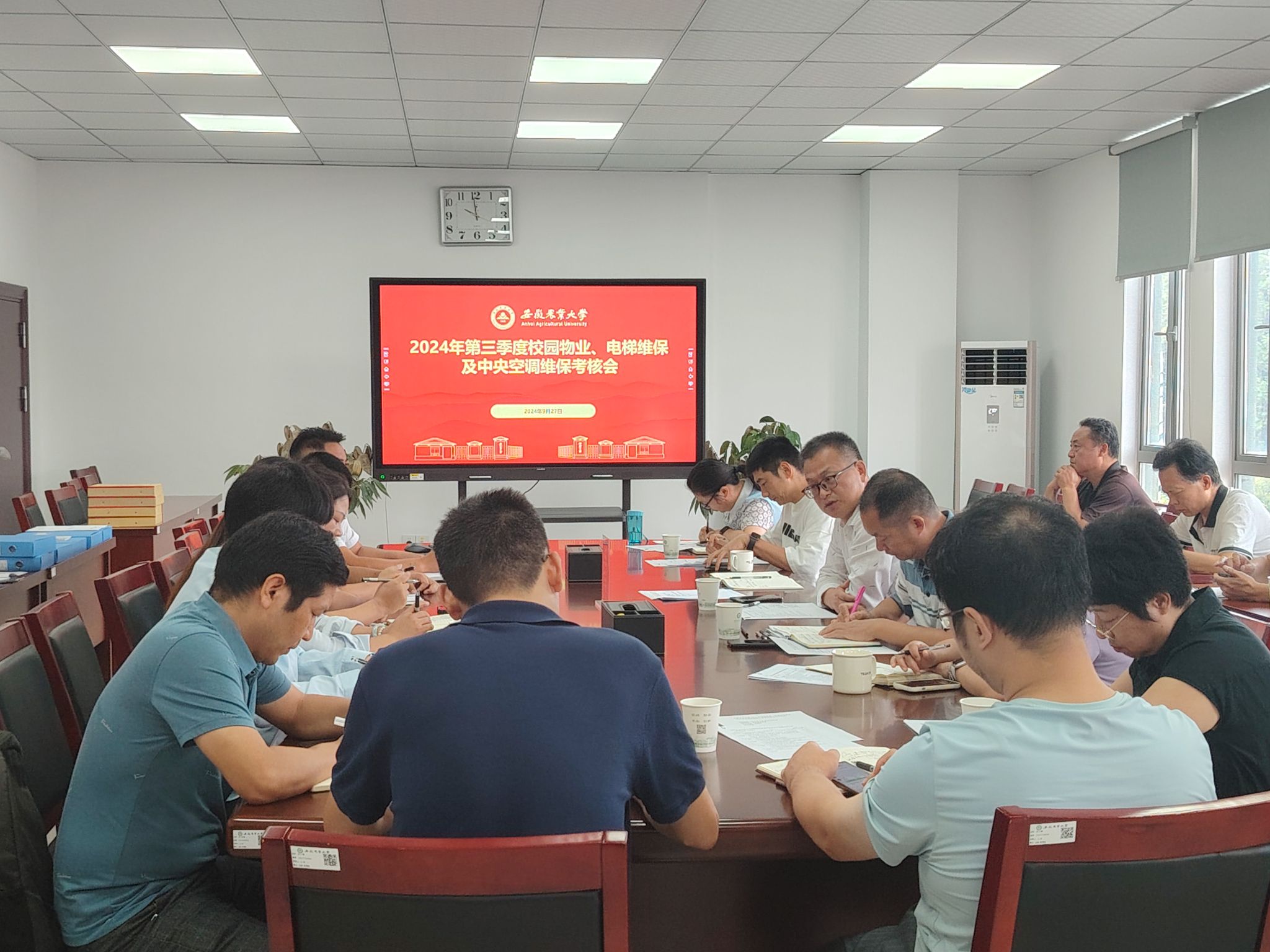 本网讯 9月27日上午,2024年第三季度校园物业、电梯维保及中央空调维保考核会在总务部会议室召开。总务部党委书记胡启涛,副部长夏业鲍,相关科室负责人,服务对象代表及四家物业项目经理、电梯维保和中央空调维保项目经理等20余人参会。会议由总务部副部长史青松主持。