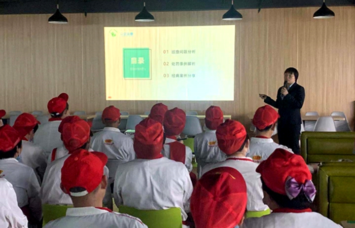 培训会主要就学生食堂每月巡检风险问题项进行解析,分享相关食品安全处罚条例和经典案例。