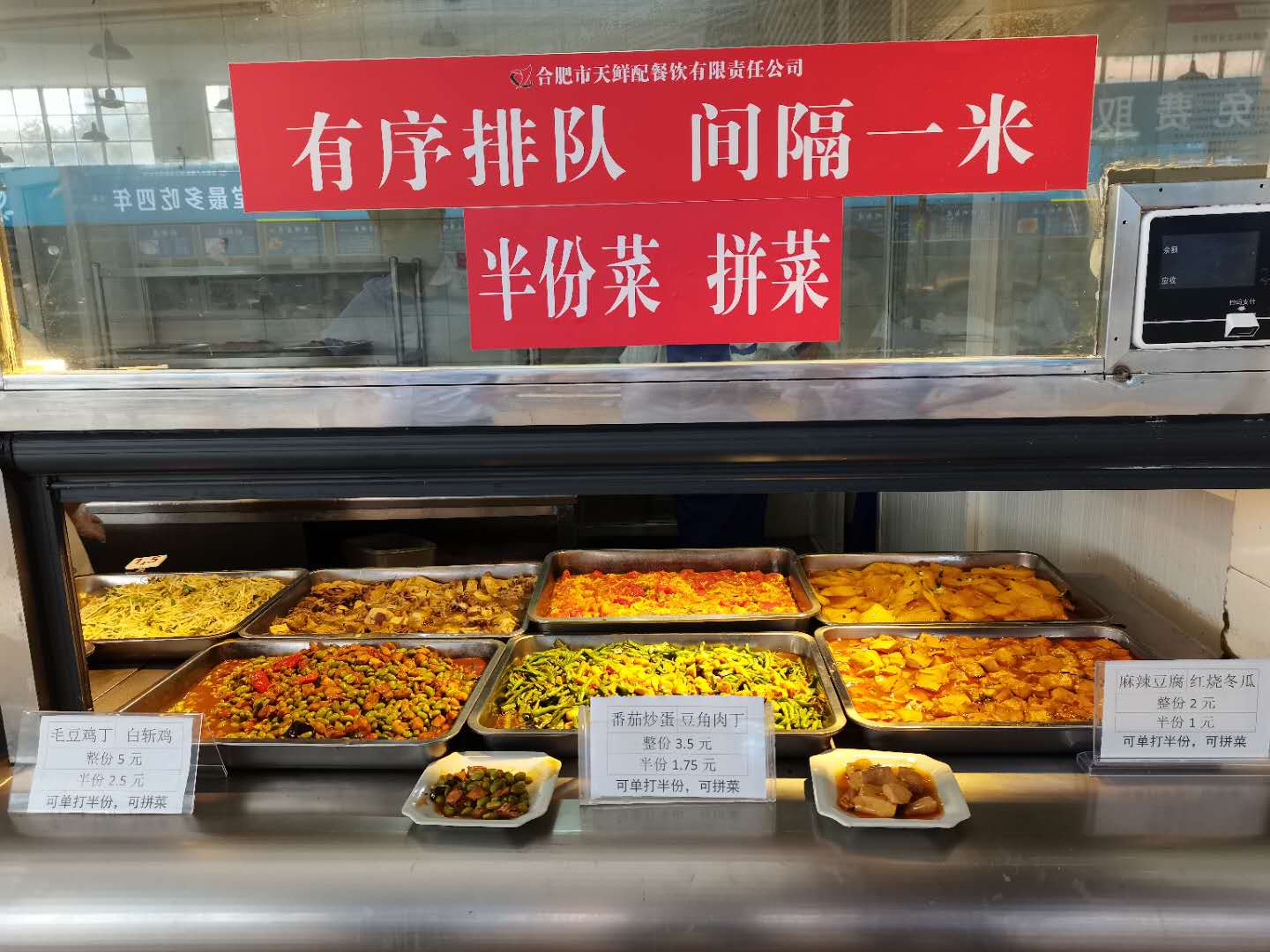 会后,全校各食堂积极行动起来,通过悬挂条幅、流动电子屏和上墙版画等方式,宣传勤俭节约、艰苦奋斗精神,营造浪费可耻、节约光荣的良好氛围。学生食堂开始制售小馒头,将原有的80g/个,增加制作成20g/个,满足饮食节约需求;对全荤菜继续实行“计量收费”,学生需要多少就秤多少;每家食堂设立半份菜和拼菜窗口以及免费加饭区,窗口设立醒目的标识标牌,学生按需购买,按量消费。