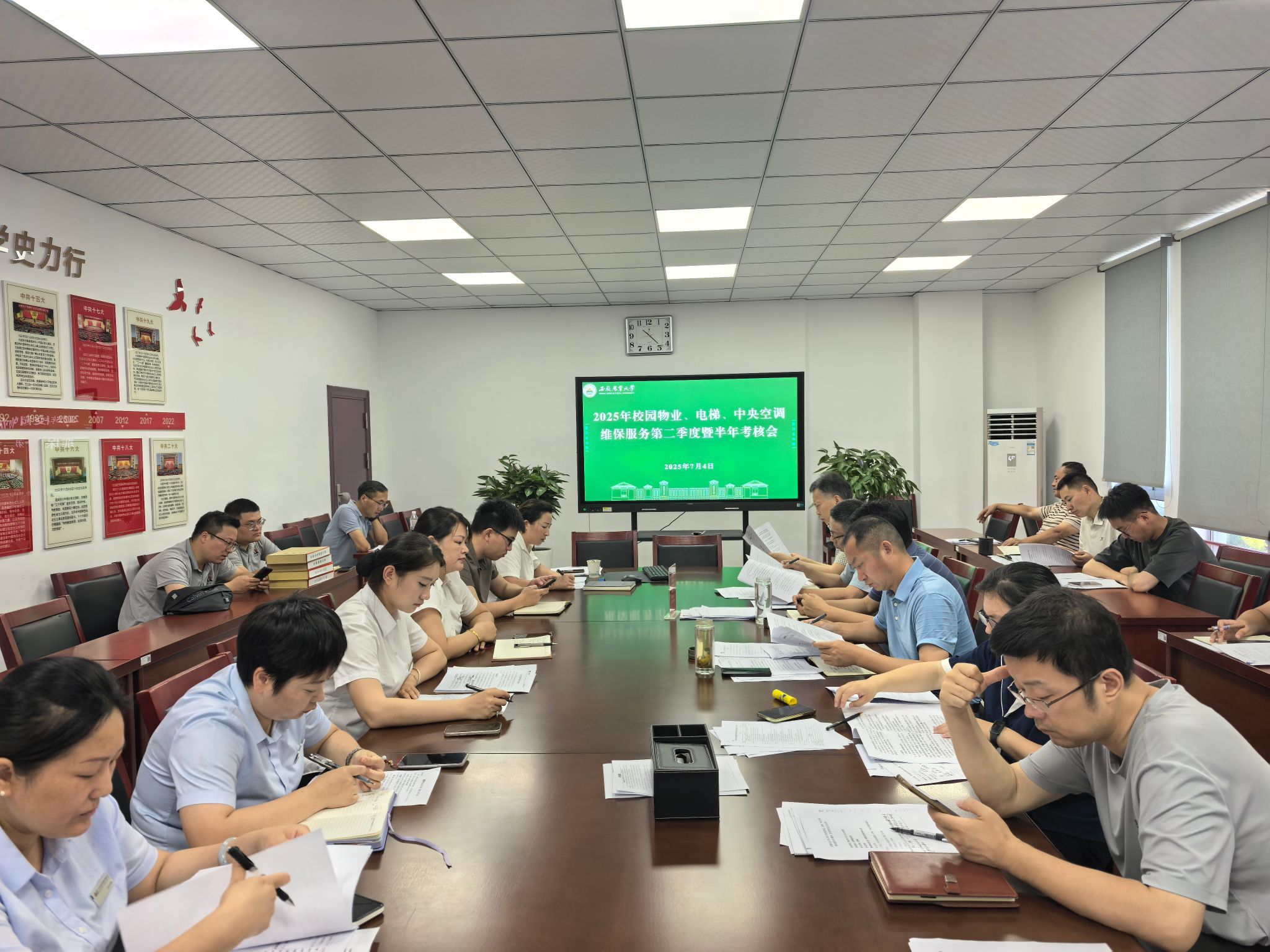 7月4日上午,2025年第二季度校园物业、电梯及中央空调维保工作考核会议在总务部会议室召开。会议由总务部副部长史青松主持,相关科室负责人、监管人员及四家物业服务企业、电梯维保单位和中央空调维保单位的项目经理等人参会。