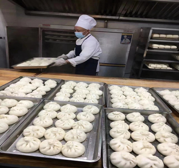 凌晨3:00,更深露重,食堂灯火通明,开火、起锅、烧油,厨房开始了盘碟的独奏,1500多个蒸点制品在6:30之前准时供应,一年1324餐,总务后勤餐饮人用心烹饪好每道菜肴。