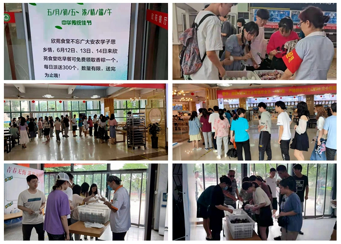 经认真筹备,各食堂端午节期间将免费发送一定数量的粽子、绿豆糕、咸鸭蛋等端午节时节令食品。6月11日至14日,6家学生食堂共免费送出蜜枣、八宝、肉粽子10700只,咸鸭蛋1000只,绿豆糕500块等。