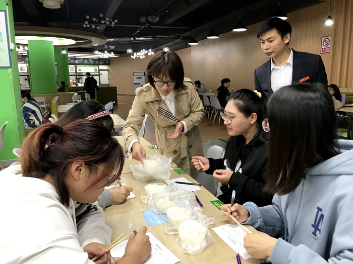 本网讯 为准确掌握校园学生食堂米饭质量情况,更好提升品质,服务学生。10月27日中餐,后勤保障处饮食服务中心邀请茶与食品科技学院2019级食品质量与安全专业的本科生对6家学生食堂的午餐米饭进行了取样和感官审评。审评活动在东苑食堂现场开展。