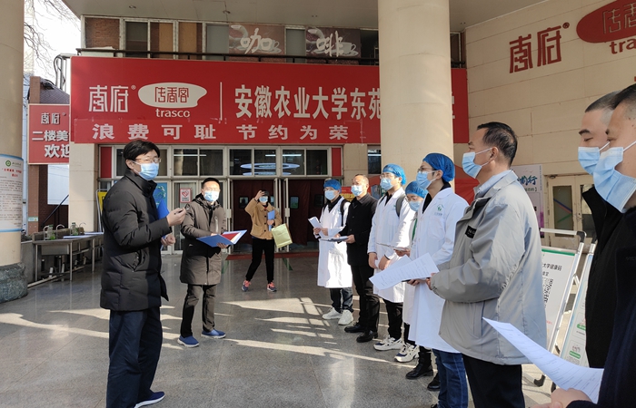 本网讯 为认真贯彻执行安徽省市场监督管理局和安徽省教育厅联合下发的《关于开展2022年春季开学校园食品安全风险隐患排查工作的通知》(皖市监函【2022】77号)精神,严防严管严控校园食品安全风险,充分保障返校学生吃的安全、吃的放心,2月25日上午,副校长、食品安全工作领导组韩军带队赴校园食堂开展食品安全专项检查。后勤保障处处长张晓伟、副处长胡明胜陪同检查。