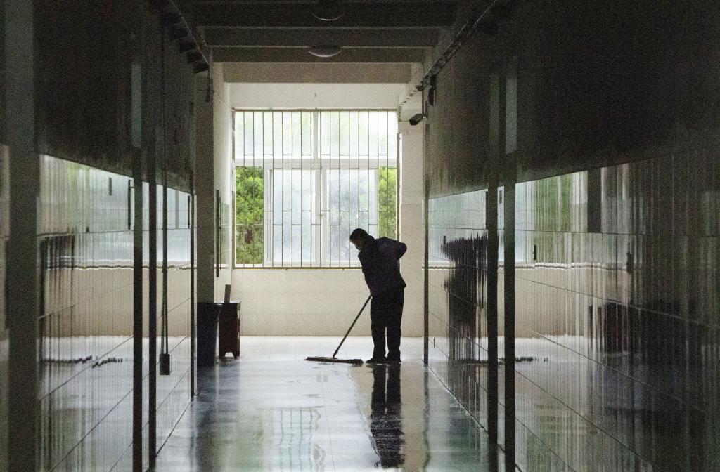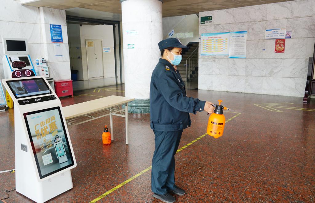 后勤工作人员在教学楼开展消杀、清洁工作