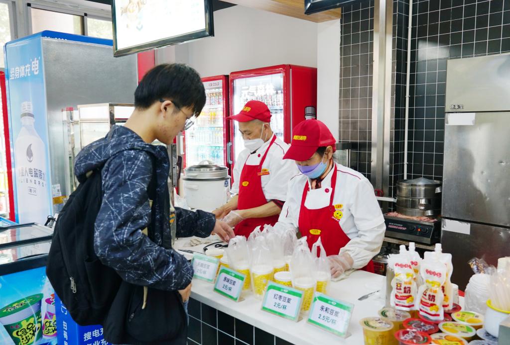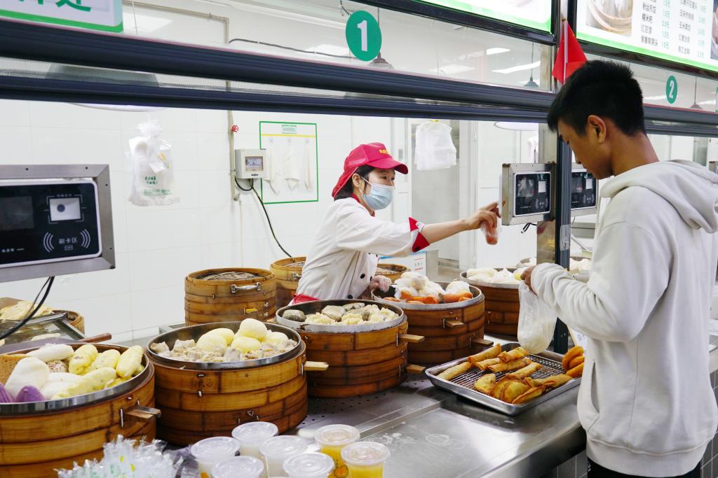 东苑食堂的餐饮工作者正在为学生提供早餐