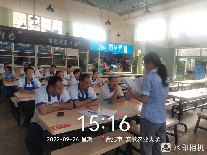 本网讯 随着2022级新生入校,秋季来临,校园食堂食品安全面临着新特点、新形势。为进一步筑牢食品安全底线,落实皖市监函〔2022〕537号文件要求。近期,校园各食堂结合实际认真开展了食品安全系列培训,培训内容和材料由后勤保障处饮食服务中心提供参考,重点学习《学校食品安全与营养健康管理规定》、市场监管总局等四部门《关于落实主体责任强化校园食品安全管理的指导意见》、《餐饮服务食品安全操作规范》、食物中毒等食源性疾病预防处置等相关知识,切实把好食品安全“入口关”。(张奎 通讯员:王政)