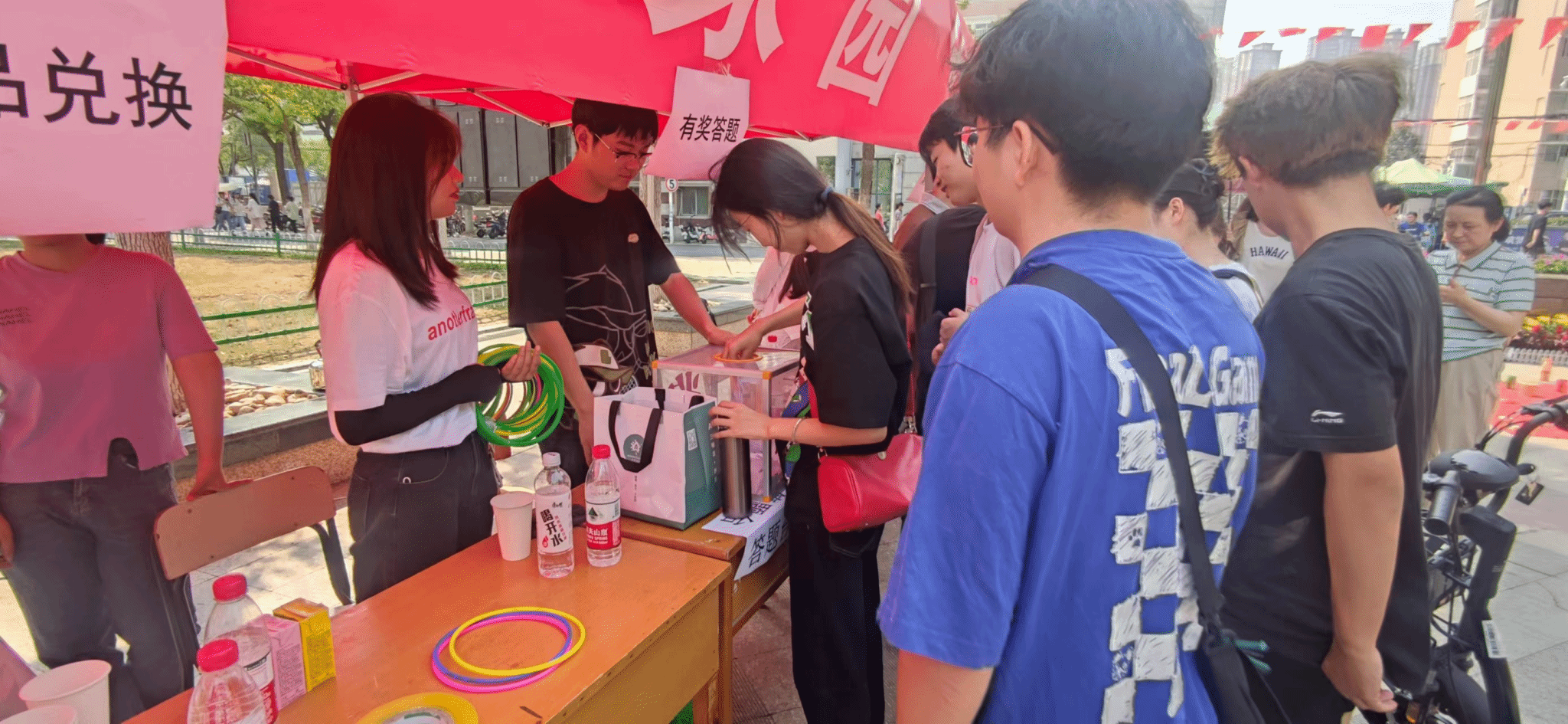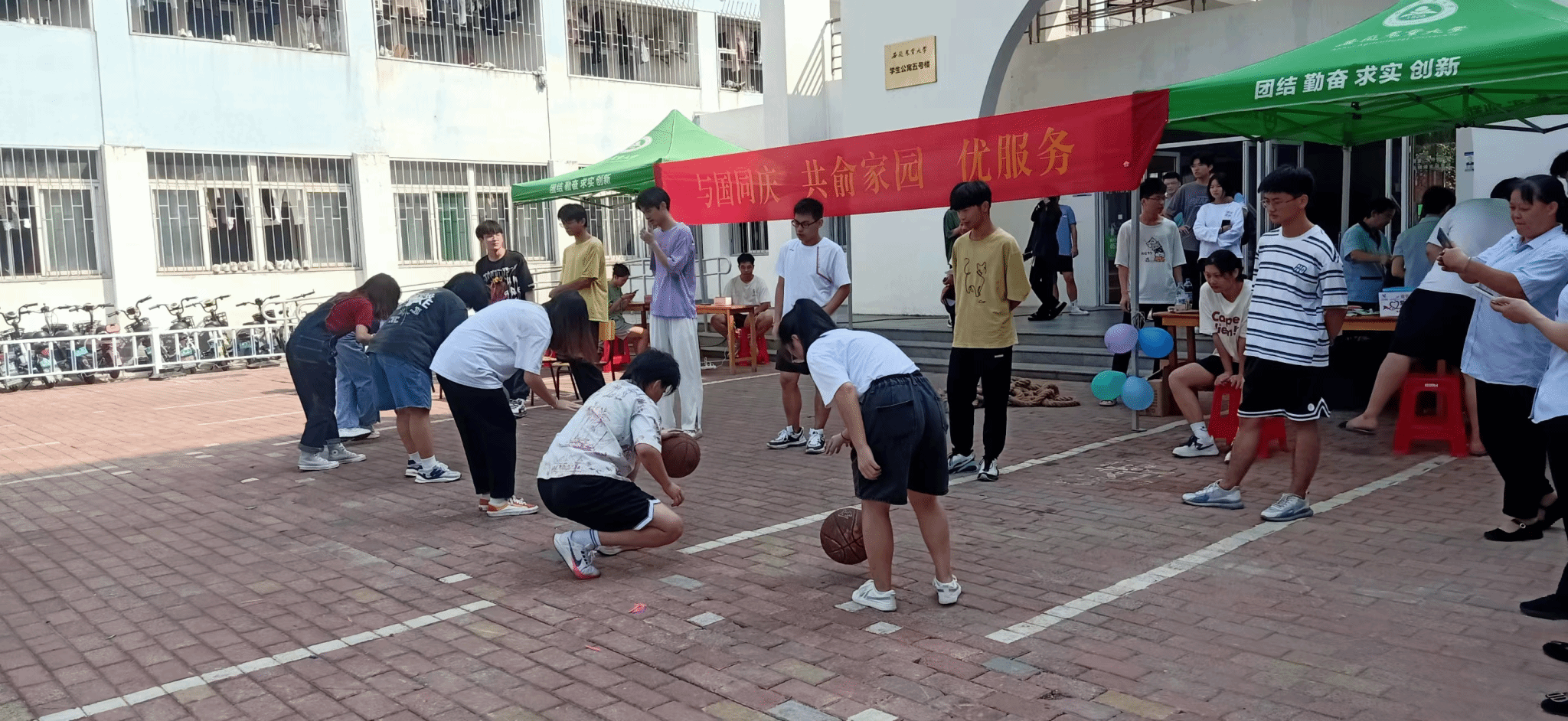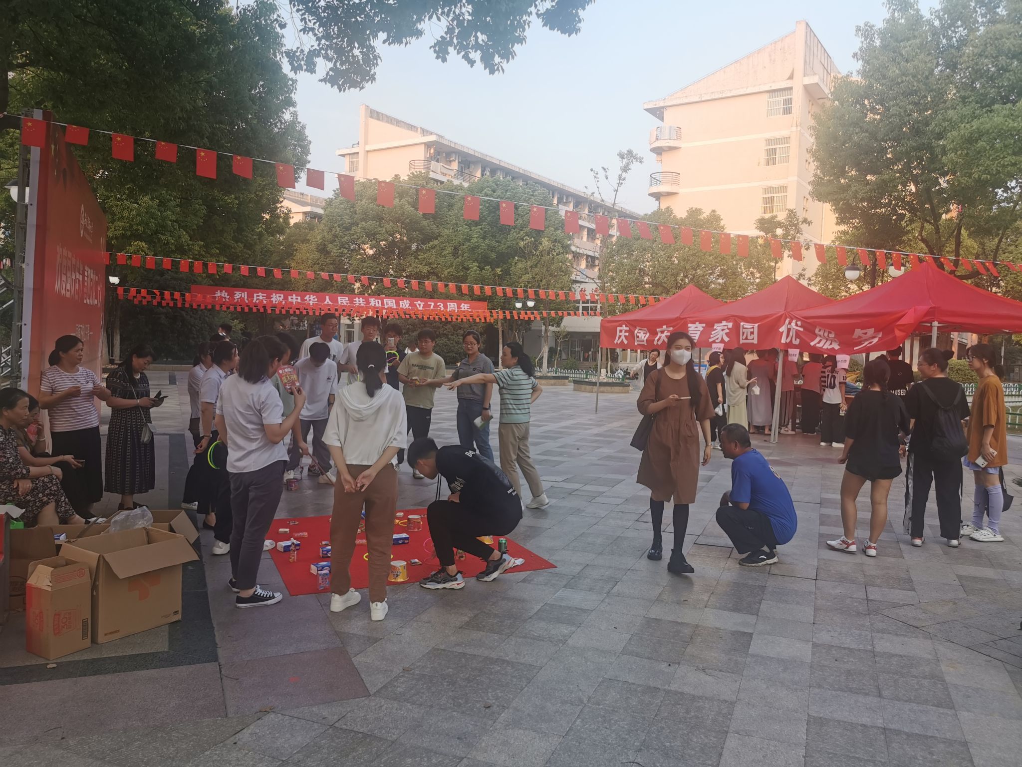 为了吸引学生参与活动,学生公寓管理服务中心精心安排,在校内公寓4-5号楼门口、北二门广场、校外公寓入口广场设立三处活动地点,爱心缝补、清洗眼镜、校园安全知识有奖竞答、废旧品更换、套圈、踩气球、滚轮胎、拍篮球、才艺表演等活动让同学们的欢声笑语充满了整个校园,传递着对祖国最真挚的祝福。(学生公寓管理服务中心)