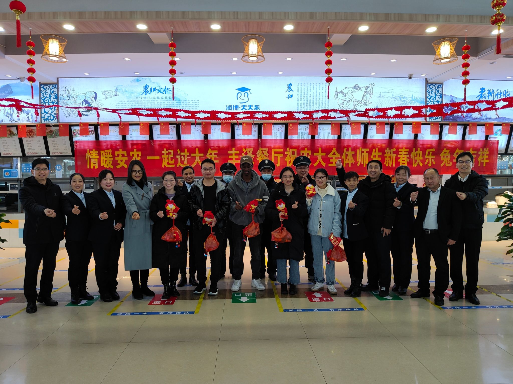 食堂内张灯结彩、喜气洋洋,大红灯笼高高挂,幸运红包、开心礼包,惊喜不断,处处洋溢着节日氛围。“留校期间吃的好不好?”、“住的暖不暖?”、“有没有什么困难?”......尽显温情;象征红红火火的羊肉牛肉火锅、年年有余的红烧大鱼、团团圆圆的老家园子、味道鲜香的老鸡汤...... 不论是菜谱设计,还是烹饪过程,都尽显用心、用情。师生们在举杯投箸间,在欢声笑语中,共话学校新成就、新发展,共同展望学校更加美好的明天。