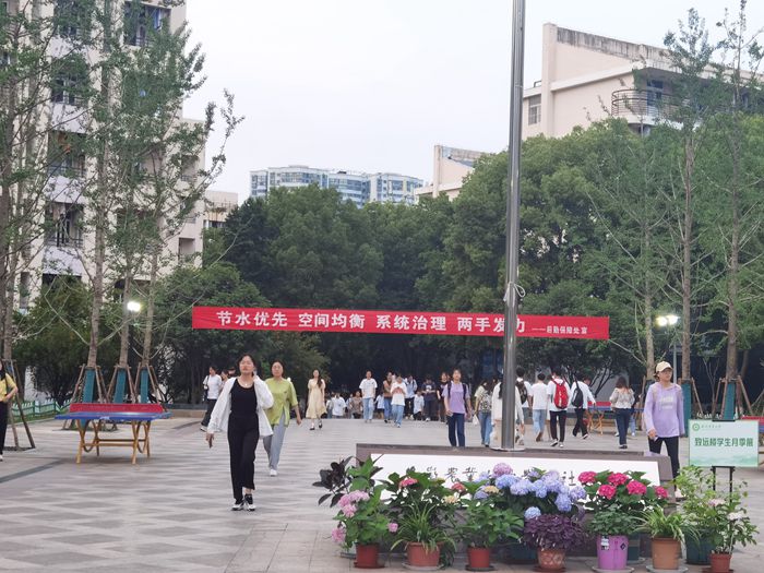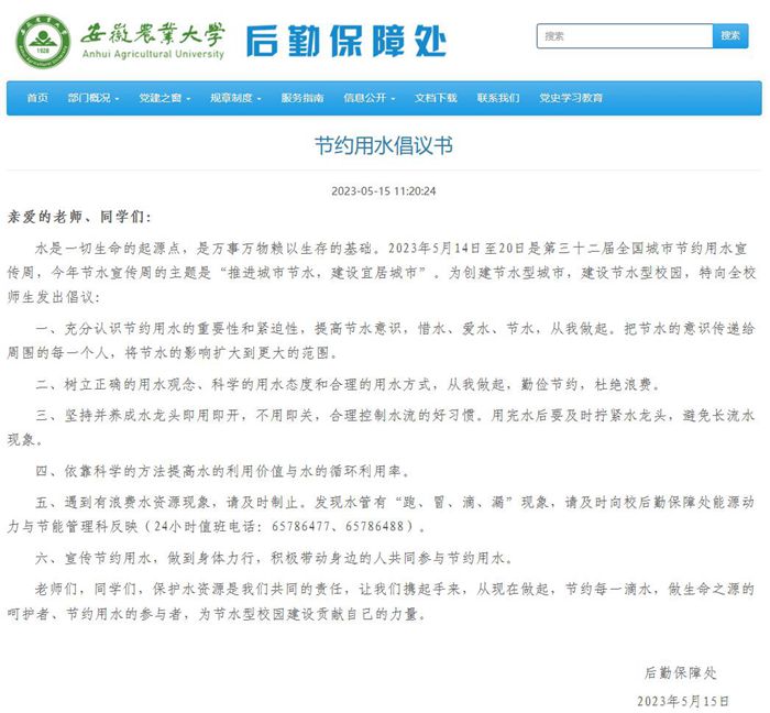 在宣传周期间,后勤保障处组织了多场宣传活动,一是开展水资源保护知识宣讲、知识普及、线上有奖答题。二是在校园运动广场、教学楼、学生宿舍楼、食堂等楼宇处悬挂节水宣传横幅。三是在电子显示屏发布系列节约用水的宣传文章和视频。四是通过校园电子信息平台、后勤保障处网站发布推送《节水倡议书》,向师生传递了节约用水的理念和方法。五是组织师生对校园重要用水部位进行巡检,重点巡查是否有跑冒滴漏的现象,对发现浪费水的情况进行现场处置,对漏水情况上报相关职能部门进行及时维修整改。