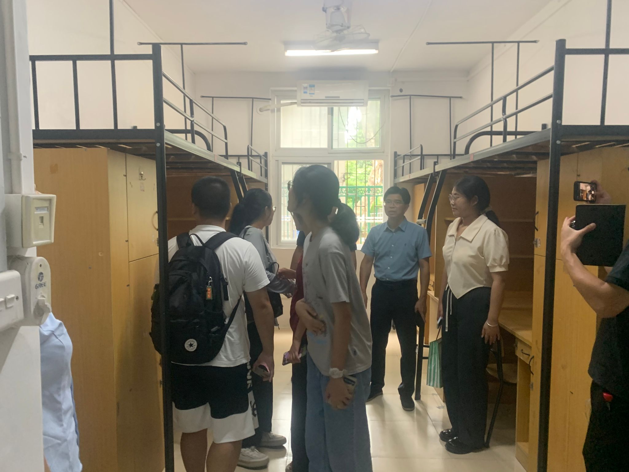 大家先后走进学生社区南区和北区的新生宿舍楼,实地查看各楼宇的宿舍环境、物资的准备和迎新准备情况,先后检查了宿舍内床、柜子、桌子的牢固性、安全性,公共区域的开水房、吹风机、刷卡器/扫码器等设备设施稳定性、可靠性。并对存在的个别家具安装不牢固、铁钉等铆件突露等进行了提醒提示。
