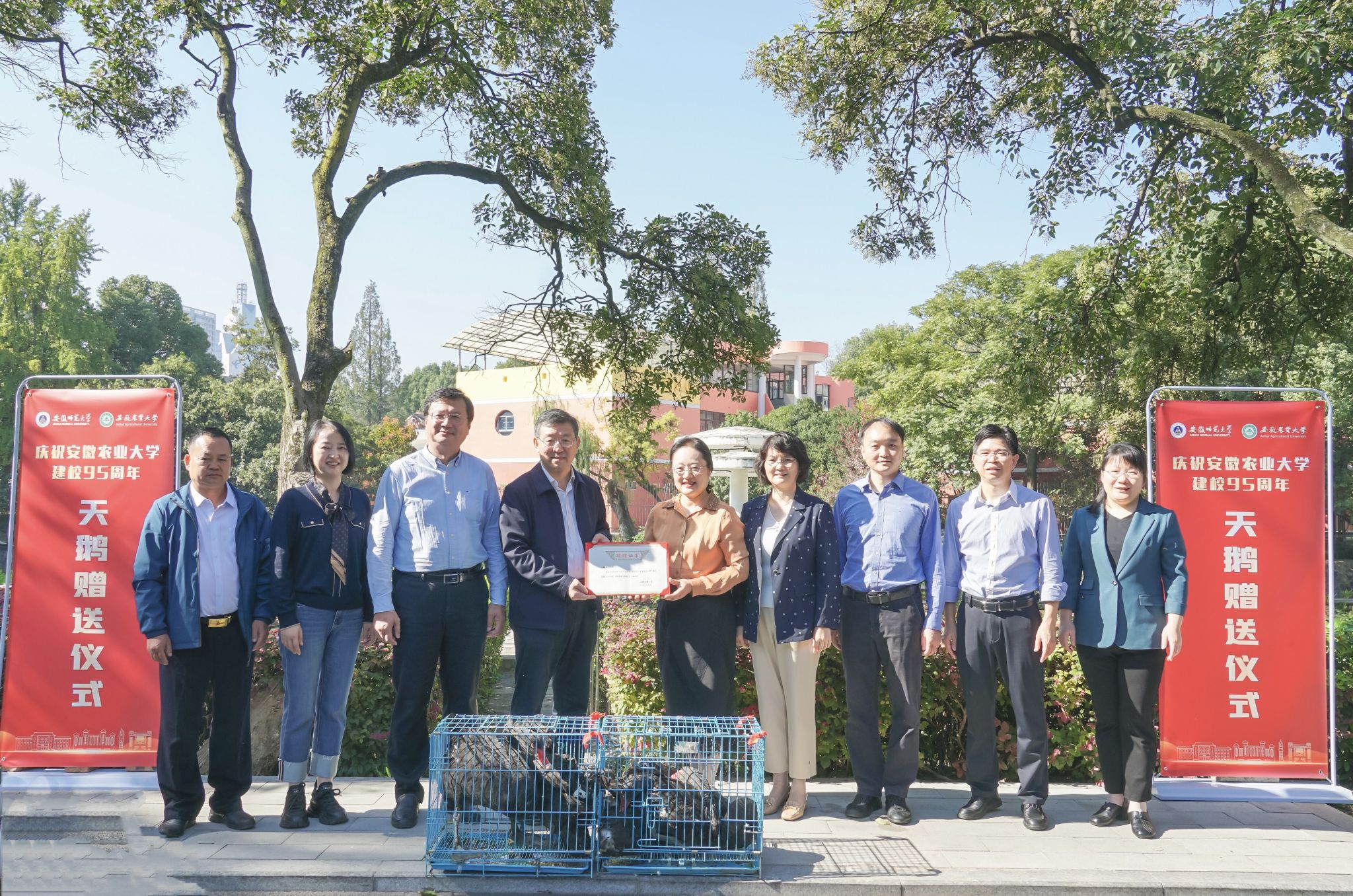 本网讯 10月17日,安徽师范大学党委副书记周旭代表安师大赠送4只天鹅,作为建校95周年的贺礼。我校1986届校友华仁农牧集团有限公司董事长张新先生也赠送了两只皖西大白鹅。校党委常委、副校长李红主持了赠送仪式。