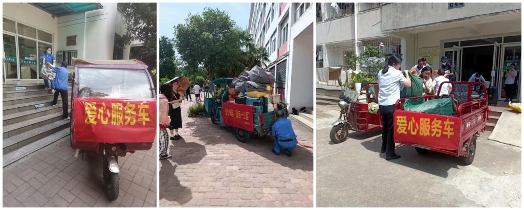 为了帮助学生运送大件行李物品,助力毕业生顺利离校“最后一公里”,学生公寓党支部组织宿管、物业员工组建毕业季“爱心运输队”,使用电瓶车、三轮车帮助学生点对点运送行李。高温、烈日都无法阻挡宿管团队的爱心与热情,鱼贯而出的爱心车队,犹如挂在天际边一道夺目的彩虹,灿烂而又温馨。