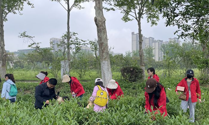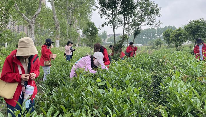 杨老师简单的介绍了茶叶的品种和制茶工艺,教授了采茶的基本要点。大家怀揣期待,背上茶篓,化身茶农,伴着一声声笑语,一张张欢颜徜徉在茶叶园地之间。手指轻捻,一片片嫩叶载入篓中,一抹抹“红色”身影成为靓丽风景线。